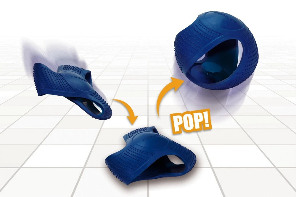 Je kunt de bal platdrukken zodat de zuignap de gedeeltes goed aan elkaar vastmaakt. Hierdoor krijgt het speeltje de vorm van een frisbee, waardoor deze eenvoudig is mee te nemen en gemakkelijker kan worden gegooid. Zodra de frisbee eenmaal op de grond terecht komt, klapt deze open en is het speeltje weer een bal. Leuk om samen met jouw hond te apporteren!